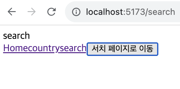 <Home/> 컴포넌트에서 버튼을 눌렀을 때, <search/> 컴포넌트로 이동하는 것을 확인할 수 있다.