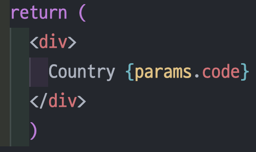 Country 컴포넌트로 이동 후 URL Parameter를 이용하기 위해 useParams라는 훅을 불러와준다. 그리고 변수를 생성해서 useParams를 호출해 준다. 이렇게 되면 params라는 변수에 현재 URL Parameter 값들이 객체형태로 저장된다.
