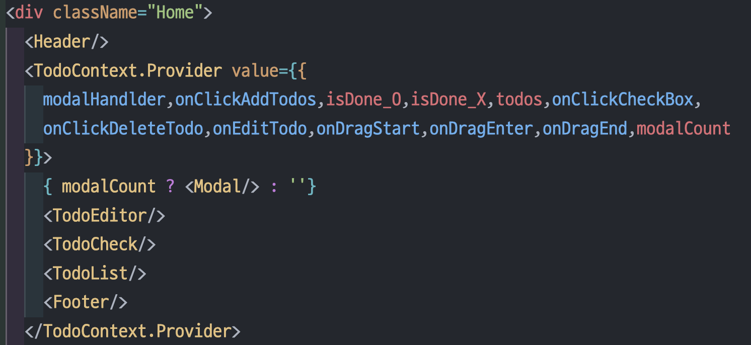 최상위 컴포넌트인 Home.jsx에서 Footer 컴포넌트를 불러옵니다. 이때 Footer 또한 Context를 통해 함수를 제공할 것이기에 TodoContext.provider 컴포넌트 내부에 넣었습니다.