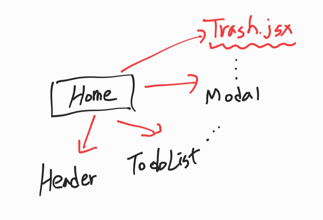 쓰레기통을 처음 생각할 당시만 해도 위의 사진과 같이 투두리스트 컴포넌트(Home.jsx)의 자식 컴포넌트로 휴지통 컴포넌트(Trash.jsx)를 만드려고 했었습니다.