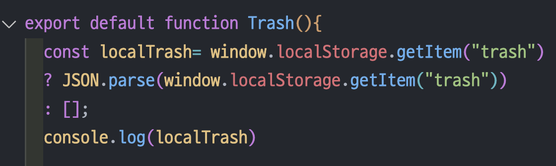 기존의 투두리스트 로직과 동일합니다. 페이지가 마운트 됐을 때, localStorage에 ‘trash’가 있다면 가져오고 없다면, 빈 배열을 반환하는 변수 localTrash를 생성합니다.