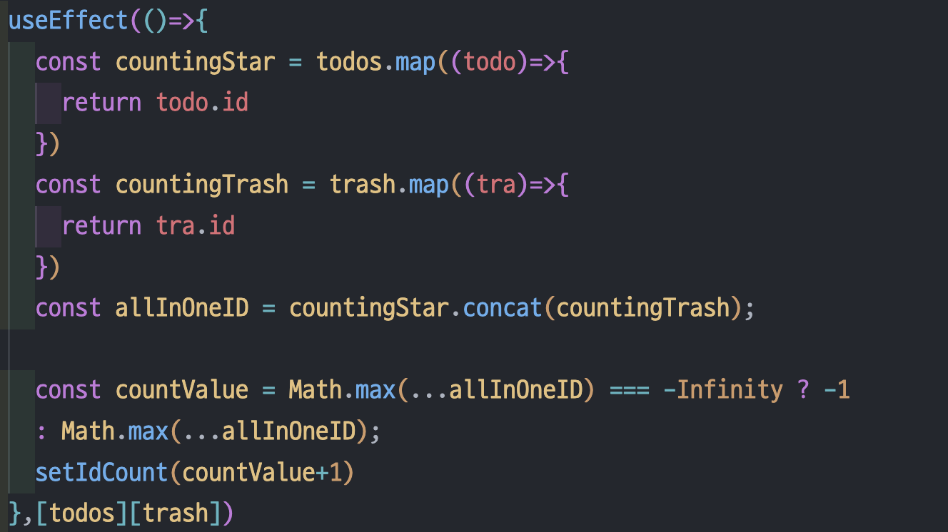 지난번에 만들었던 id 생성 로직입니다. 이 로직에서 todos의 id 뿐만 아니라, trash의 id 또한 함께 받습니다. 그리고 한꺼번에 합친 후, 합친 값의 최댓값+1을 새로운 요소의 id로 사용하면 될 것 같습니다.