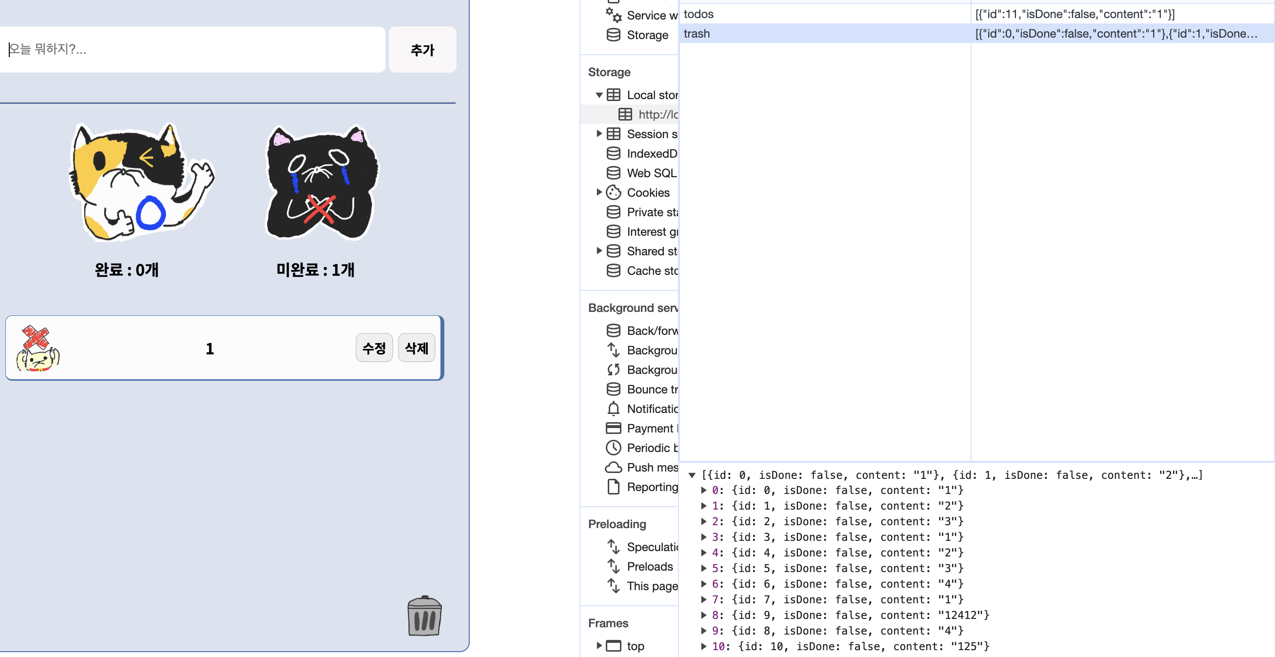 기존의 todos를 localStorage로 올리는 코드에 trash를 추가하게 설정했습니다. trash 값이 변동될 때마다 똑같이 localStorage에 업데이트될 것입니다.