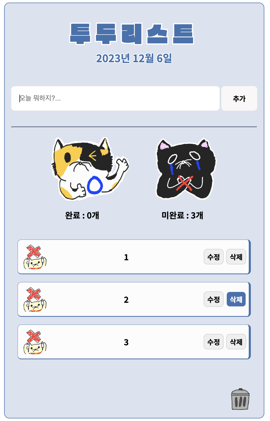 | 투두리스트 휴지통 만들기 (지우기,초기화,복구) (0) | 2023.12.07 |