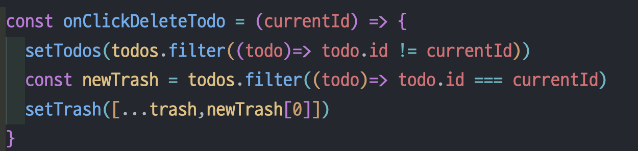 삭제 원리는 삭제버튼이 눌린 객체의 Id와 일치하지 않는 객체만을 반환하는 겁니다. 이렇게 되면 일치하는 객체는 반환되지 않으며 최종적으로 todos State에서 사라지게 되겠죠.