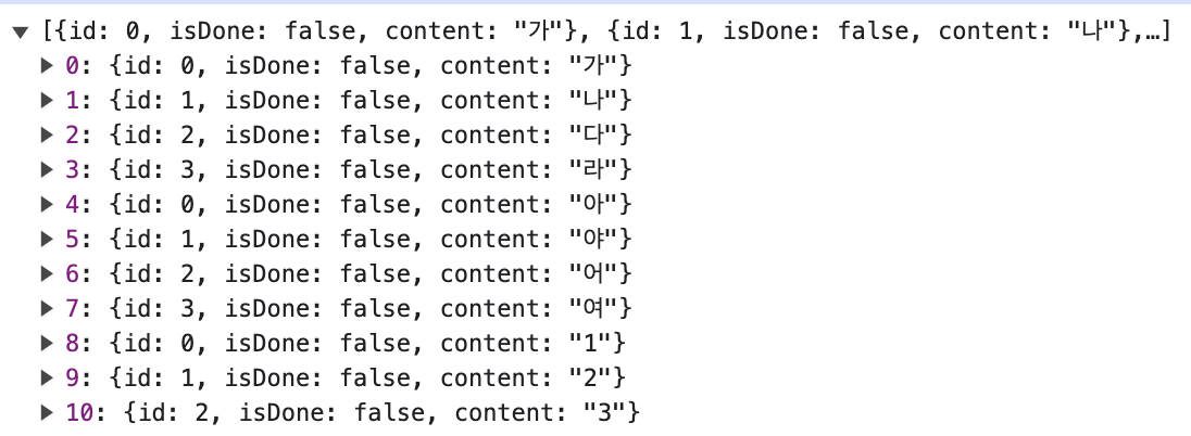 - 네 번째 줄은 todos의 id는 없고 삭제된 요소의 아이디 0,1,2 [ + 0,1,2]