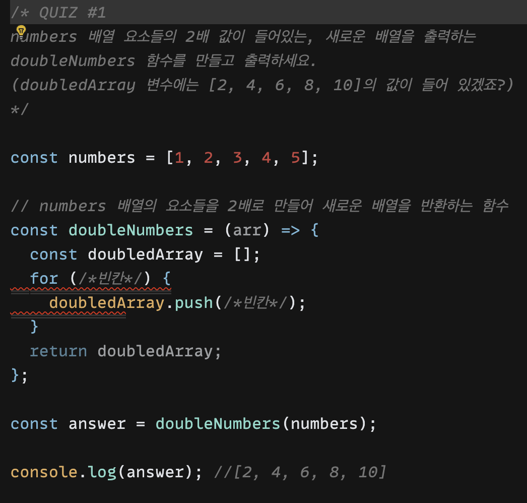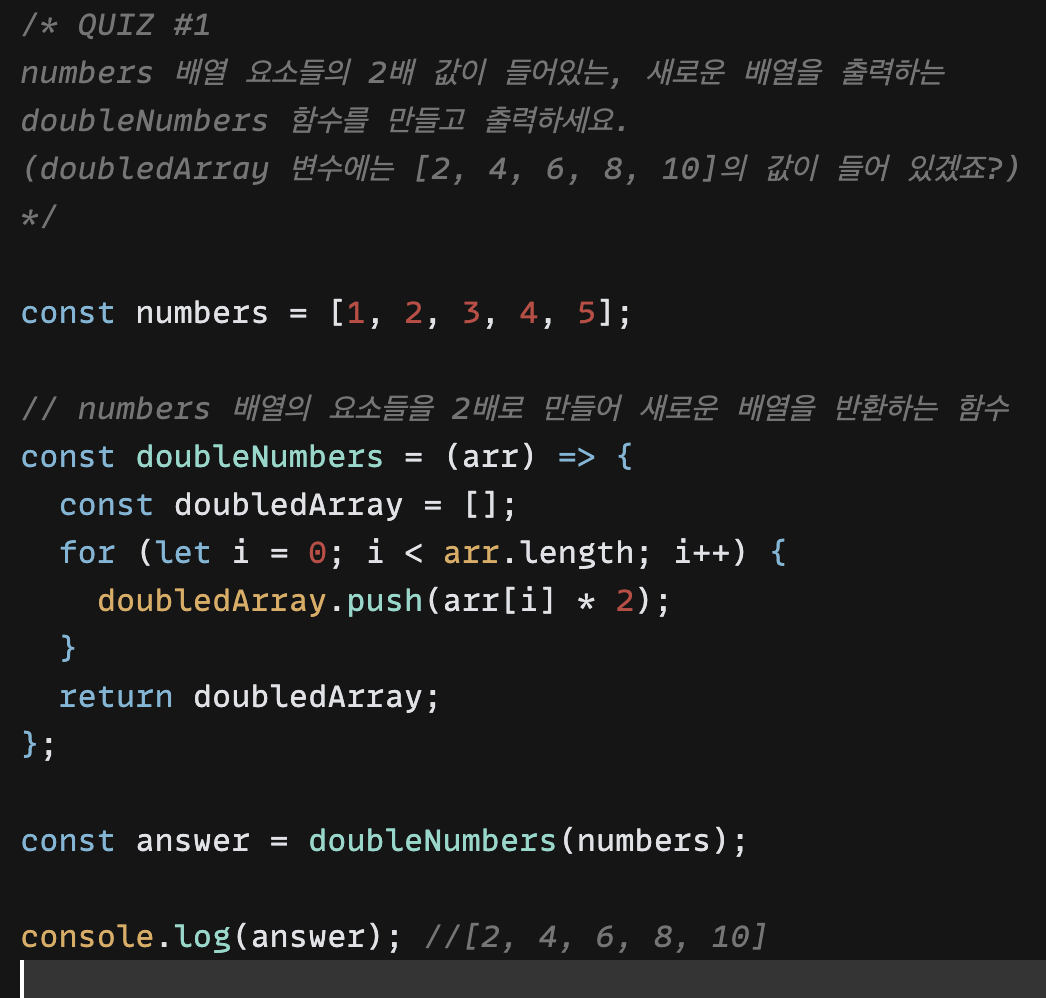 객체와 마찬가지로 const로 선언된 배열도 수정 가능하다. 배열 요소를 수정할 뿐, 배열 자체를 수정하는 것이 아니기 때문!