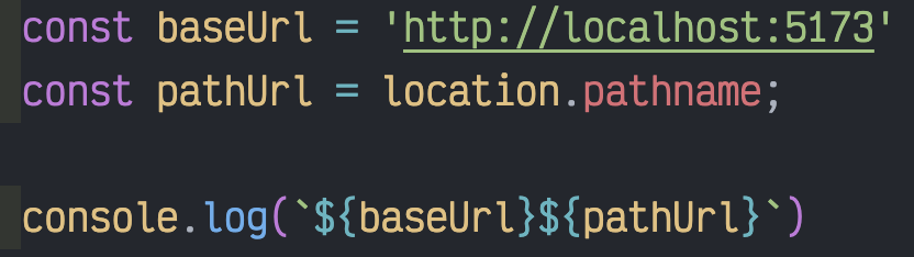현재 로컬 주소를 baseUrl 변수로 저장하고 location 훅에서 가져온 경로를 pathUrl 변수로 저장합니다. 이후 출력해 보면 현재 페이지의 주소가 잘 나오는 것을 확인할 수 있습니다.