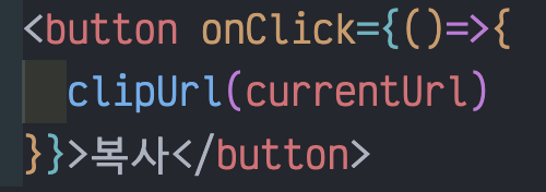 복사 버튼의 onClick 핸들러로 clipUrl 함수를 넣어주고, 인수로 현재 주소를 저장한 currentUrl 변수를 전달해 주면 끝입니다.
