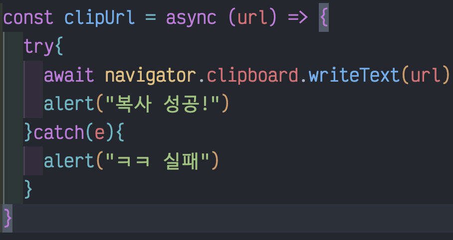비동기로 메서드가 실행되기에 async, await를 사용했으며, try, catch를 통해 에러 핸들링을 했습니다. clipUrl 함수가 실행되면 writeText 메서드에 인수로 전달되는 값을 복사합니다.