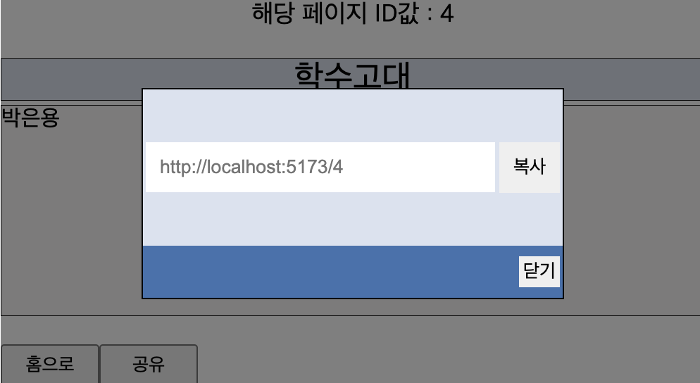이번 프로젝트에서 사용할 URL 복사 기능을 구현해 볼 것입니다. 우선 '공유' 버튼을 눌렀을 때 띄울 모달창을 먼저 만들었습니다.