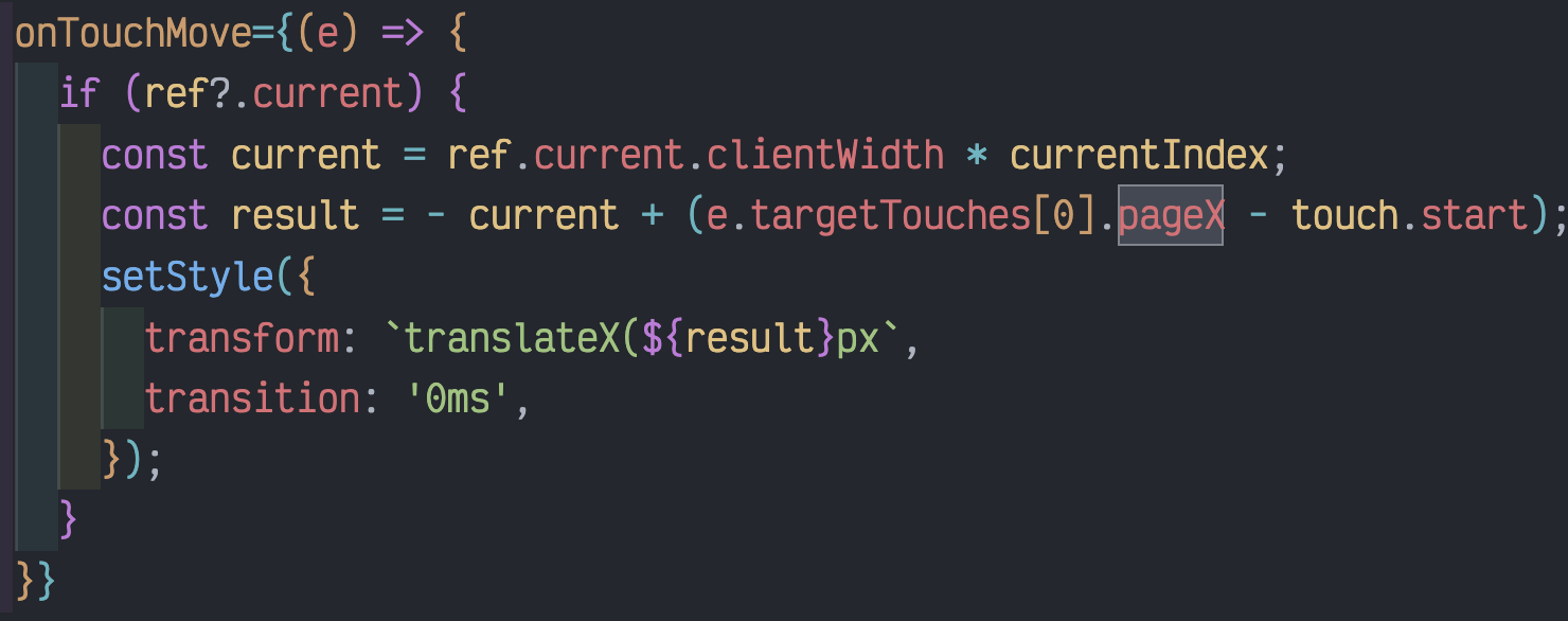 다음으로 e.targetTouches[0].pageX와 첫 터치의 x값인 touch.start를 빼줍니다. 그리고 해당 값을 current의 값에서 빼고 result변수에 저장합니다. 마지막으로 setStyle의 translateX 인자로 전달해 저장해 주면 끝입니다.