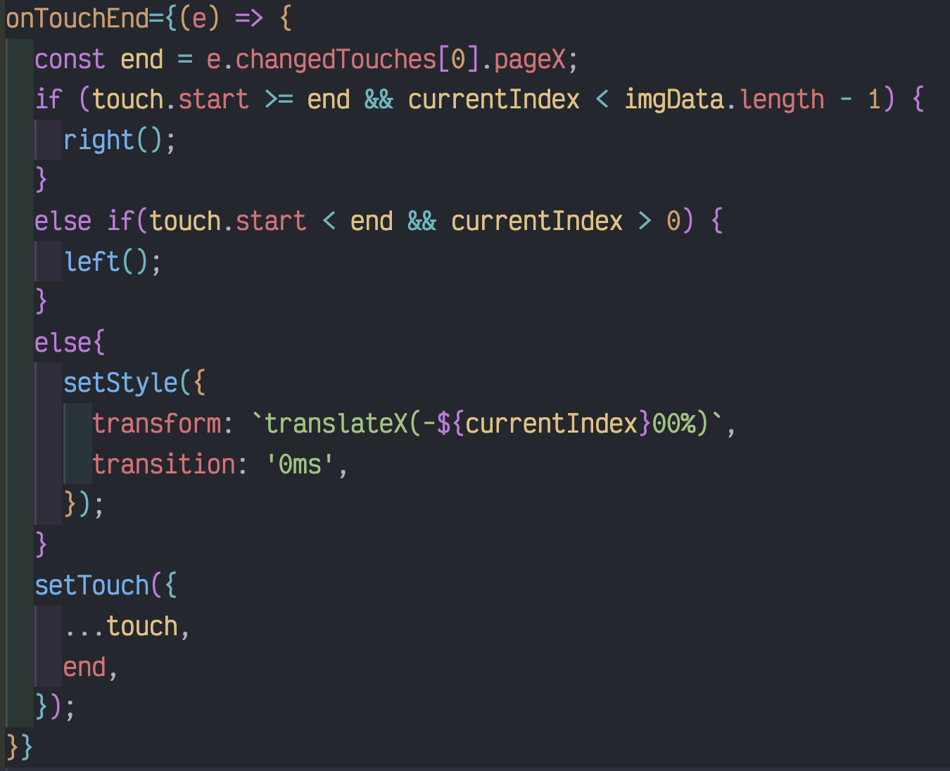 onTouchEnd은 간단합니다. 드래그가 끝난 지점의 x값을 변수 end에 저장하고, 시작지점이 끝 지점보다 크다면 오른쪽으로 넘기고, 반대라면 왼쪽으로 넘기면 됩니다. 다만 첫 사진과 마지막 사진에서는 함수가 실행되지 않게 합니다. 왜냐? gif를 보시죠