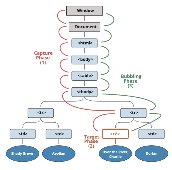 위의 사진에서 td 요소를 클릭하면, 최상위 조상에서 시작해서 아래로 전파되는 캡처링 단계, 이벤트가 타깃 요소에 도착하는 타깃단계, 그리고 다시 위로 전파되는 버블링 단계를 거치게 된다.