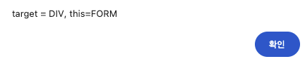 p 태그를 눌렀을 때는 target = P, this=FORM가 출력되고, div 태그를 눌렀을 때는 target = DIV, this=FORM 가 alert로 출력되는 것을 확인할 수 있다.