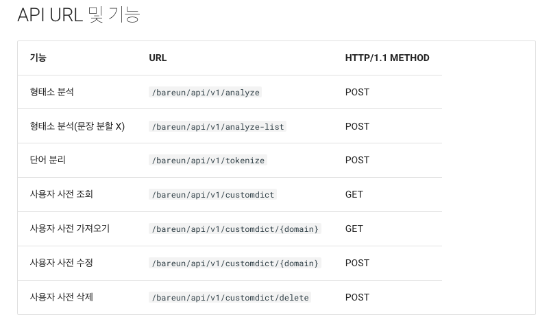 공식문서를 보면 다양한 기능을 제공해 주는 것을 확인할 수 있다. 바른이 설치된 본인 서버의 도메인에 붙여서 사용하면 된다. 나는 명사 추출 기능이 필요하기에 형태소 분석 기능(/bareun/api/v1/analyze)을 사용할 것이다.