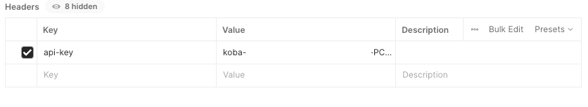 요청 헤더의 key 값으로는 ‘api-key’를, value 값으로는 발급받은 API 키를 넣어줘야 한다. 이를 넣지 않고 요청을 보내면 403이 반환된다. 난 토큰처럼 넣어야 하는 줄 알고 "Authorization: Bearer <API 키>“ 로 넣었다가 삽질했다 ㅎㅎ;