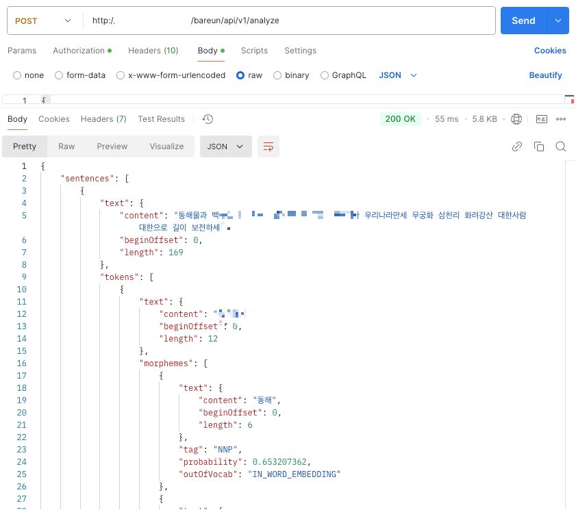 이렇게 바른의 REST 방식을 도입함으로써 형태소 분석 결과를 간단하게 얻을 수 있게 되었다.