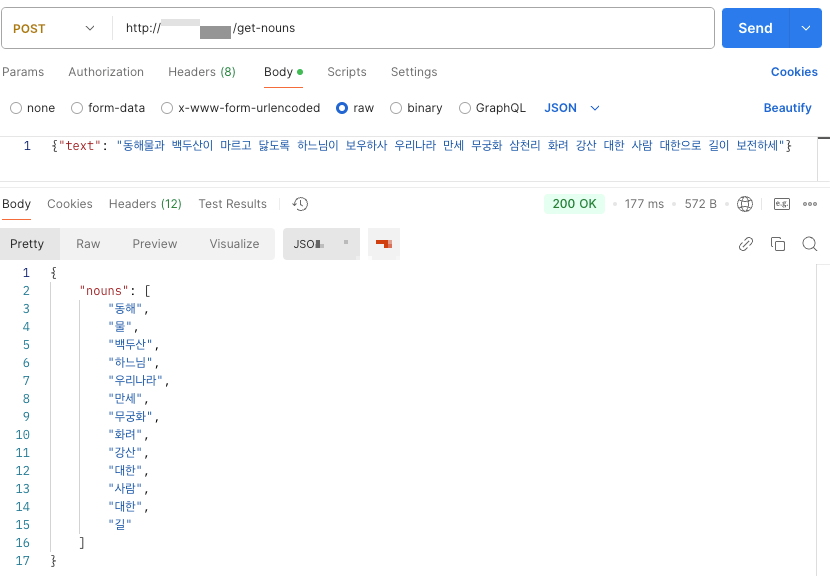 request body에 넣은 애국가 문장에 대한 형태소 분석 결과를 JSON으로 반환해 준 것이다.