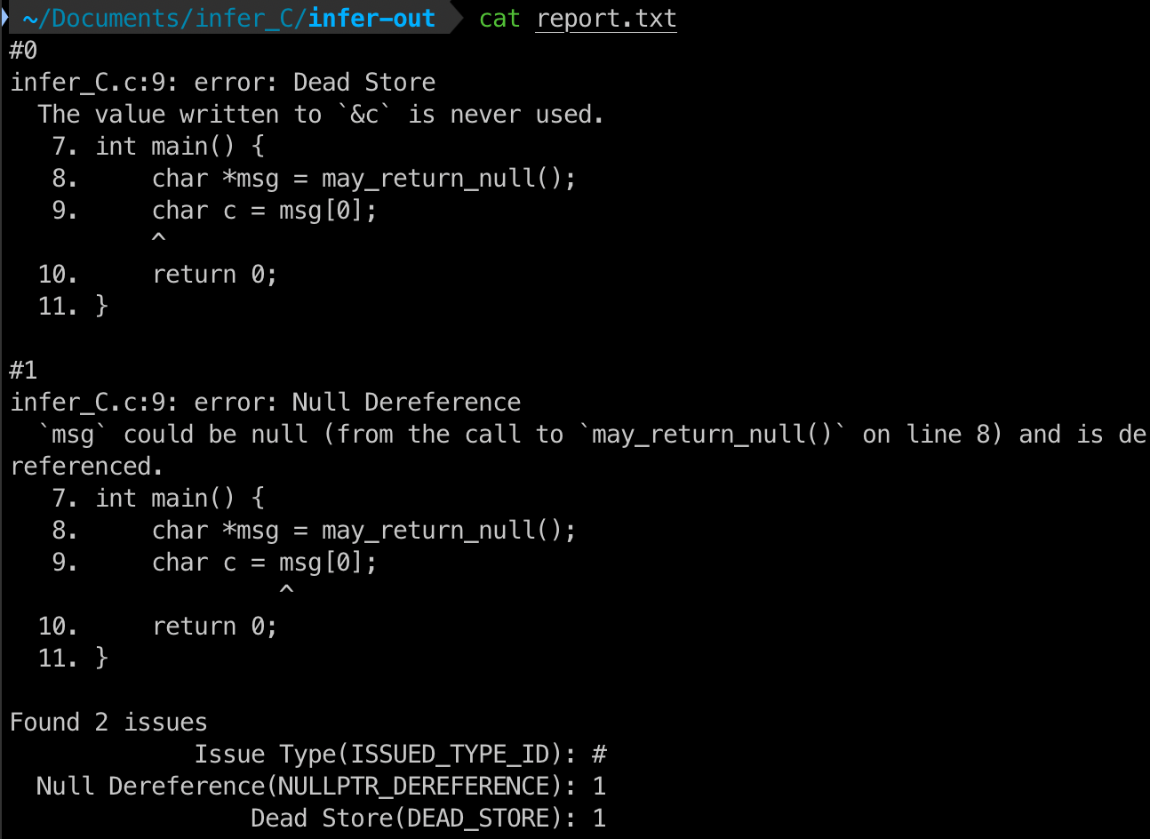 분석을 마치면 결과는 터미널에 출력되며, infer-out 폴더 내의 report.txt 파일로 저장된다. infer는 실제로 문제가 있을 가능성이 높은 오류들 위주로 필터링하여 보여준다.