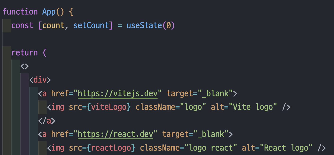 - src/App.css는 CSS를 보관하는 파일 src/App.jsx는 js코드와 react코드가 작성된다.