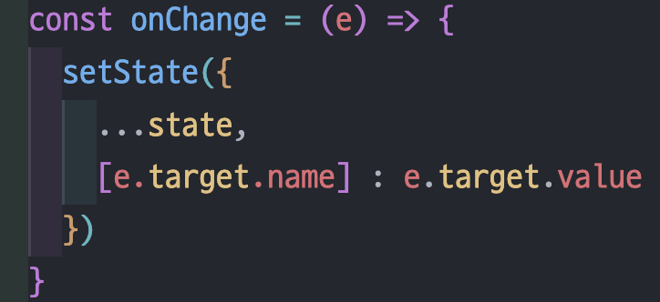 앞서 설정한 name값을 사용할 것이다. e.targer.name을 통해, 해당 요소의 name의 값을 추적해서 key 값으로 사용하고, e.target.value를 통해 해당 태그에 입력된 값을 value 값으로 사용한다.