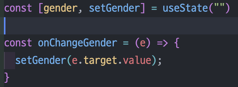 즉 name이 gender인 태그에서 onChange가 호출 됐다면, key 값은 gender이고 value 값은 사용자가 선택한 값이 될 것이다. 이 값이 setState에 인수로 전달된다. 이후 최종적으로 state의 값을 변경시킬 것이다.