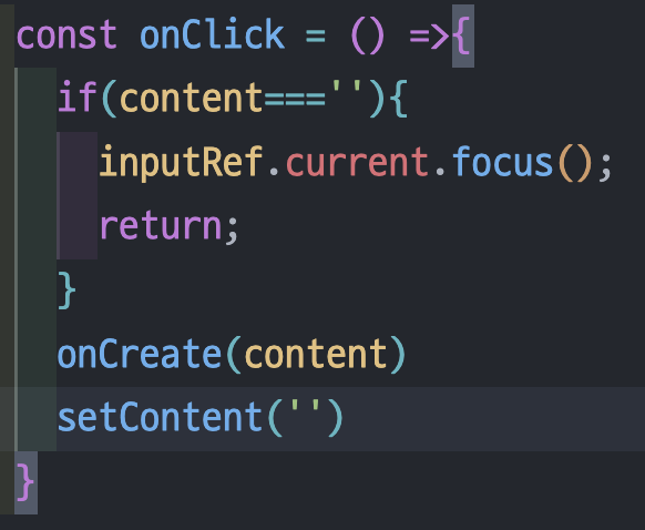 if문을 통해 content가 공백이라면 inputRef가 참조하는 값에 포커스를 주고 바로 retrun 시켜버린다. 이렇게 되면 공백일 때 아래의 onCreate(content)가 실행되지 않고, 빈 값을 보내지 않게 된다.