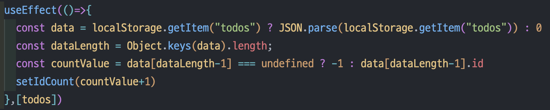 삼항연산자를 통해 로컬스토리지에 todos가 있을 시 todos의 value를 받아온다. 그리고 Object.key().length를 통해 그 개수를 확인하고, idCount State에 업데이트한다.