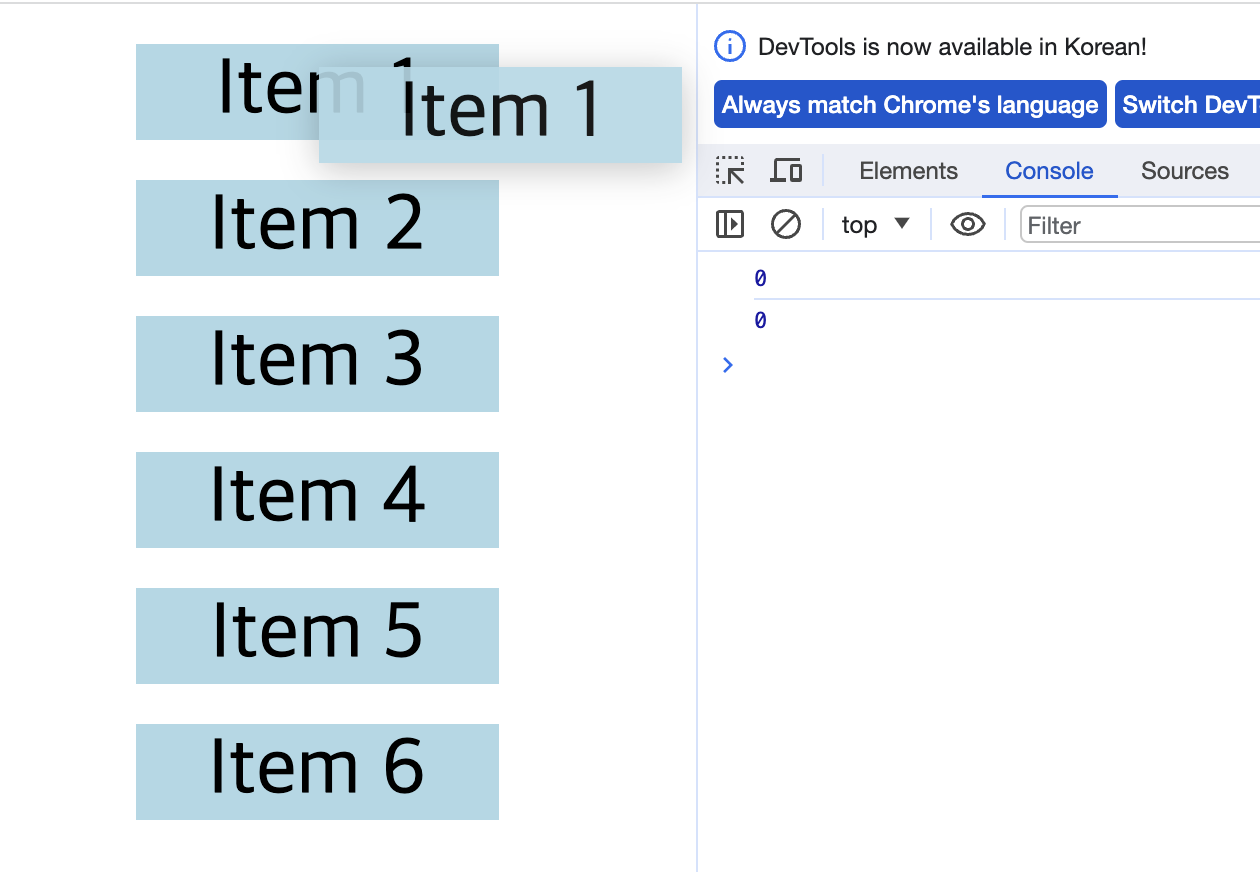 Itme 1을 선택했을 때 Item 1의 인덱스 번호가 출력됨을 확인할 수 있다. 또한 요소가 겹칠 때는 겹치는 item 2의 인덱스 번호인 2가 출력됨을 확인할 수 있다.