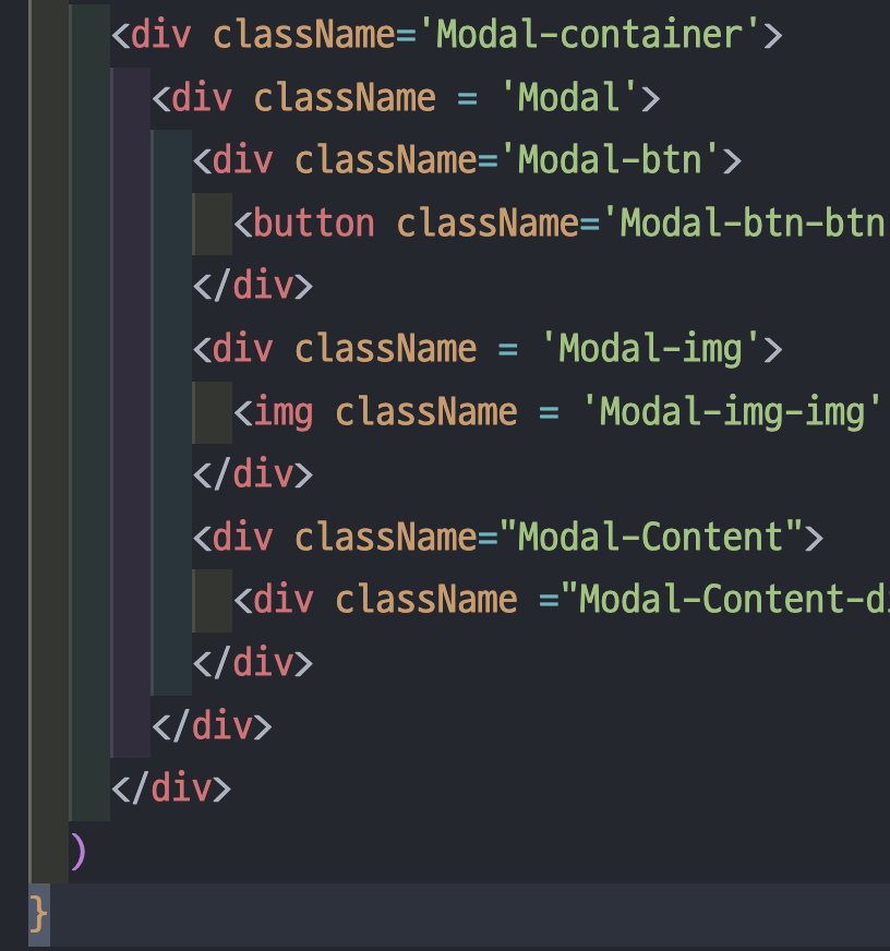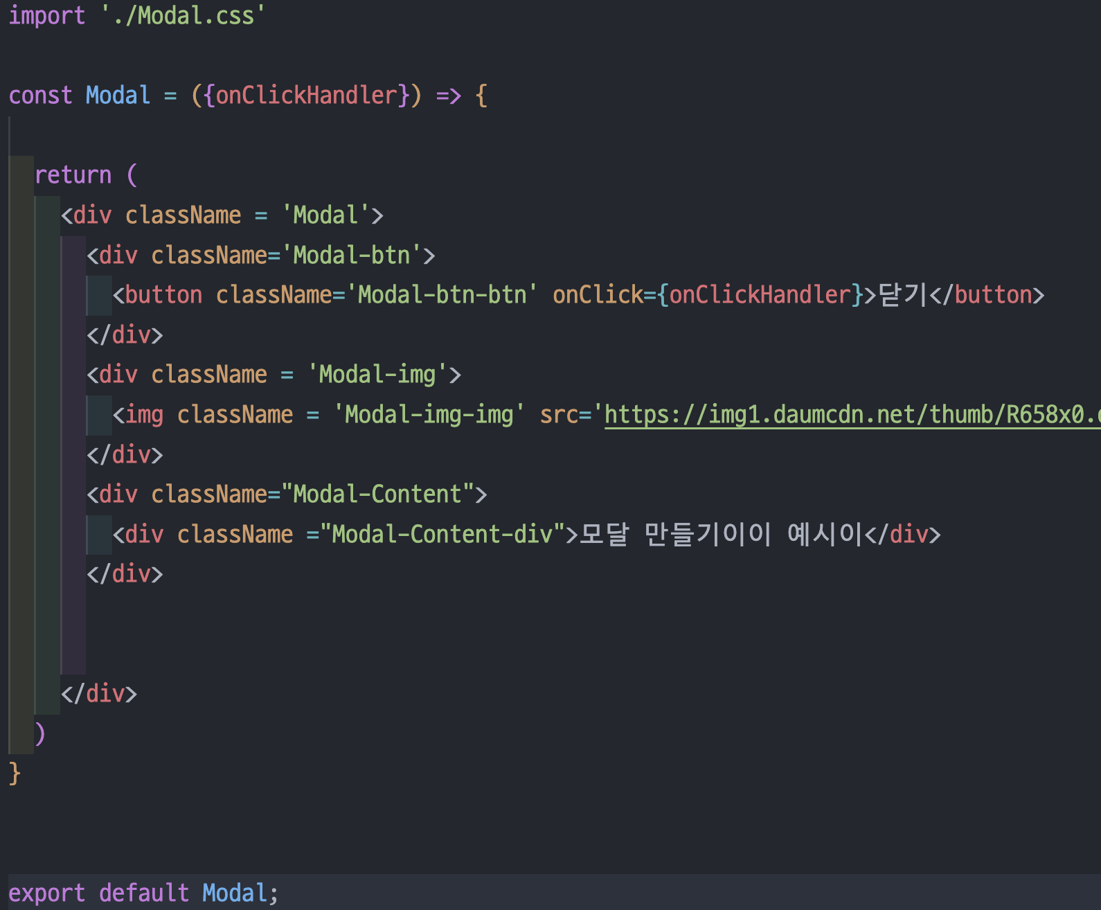 이를 위해 삼항연산자를 통해 click값에 따라 다르게 렌더링 되도록 했다. click이 true일 때 렌더링되는 Modal 컴포넌트를 살펴보자