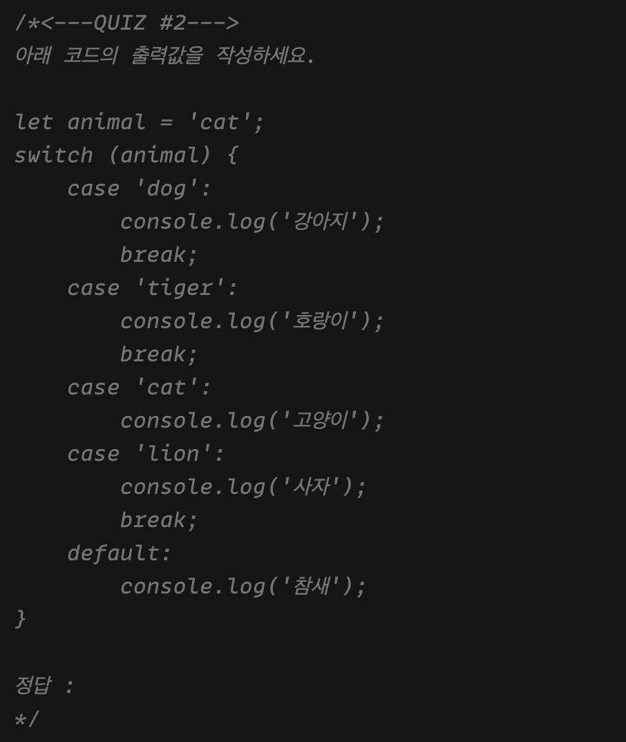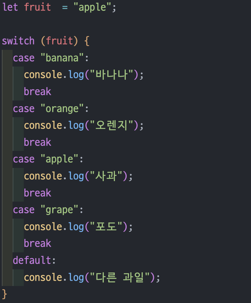 switch 옆의 괄호 안의 변수 값과 case 옆의 값이 일치하는 코드블록을 찾은 뒤, 해당 case문 블록 안에 작성된 코드를 실행 brake 가 없으면 조건에 맞는 case문 이후의 모든 코드가 실행되게 된다.