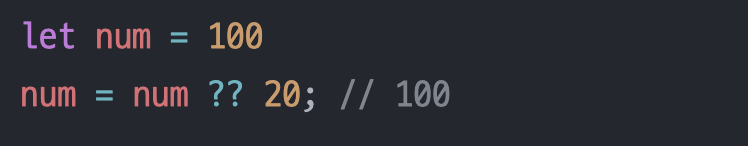 ?? 기호를 사용해서 작성할 수 있다. 위의 연산은 num이라는 값이 null, undefined라면 20을 대입하고, 그게 아니라면 현재의 num값을 유지하라는 것을 의미함