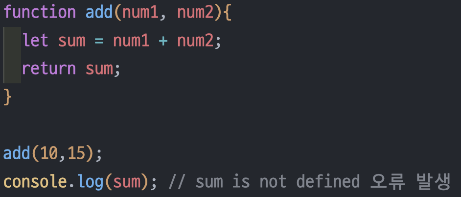 특정 함수 내부에 선언된 변수는 해당 함수의 중괄호 내부에서만 유효한, 접근이 가능한 변수이다. 이러한 변수를 지역변수라고 하고 하며, 지역변수를 외부에서 접근하면 에러가 출력된다.