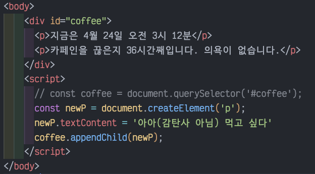 id값으로 coffee라는 값을 가진 요소를 반환받아서, 새롭게 만든 p태그를 붙이는 과정이다. 그런데 여기서 id를 그대로 붙여도 오류가 나지 않았다.