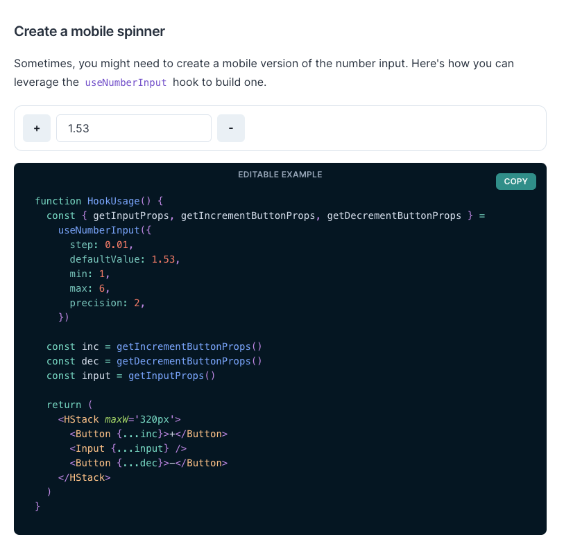 2. 각 속성이 담긴 객체를 넘기고 getInputProps, getIncrementButtonProps, getDecrementButtonProps에 해당하는 훅을 반환받습니다.