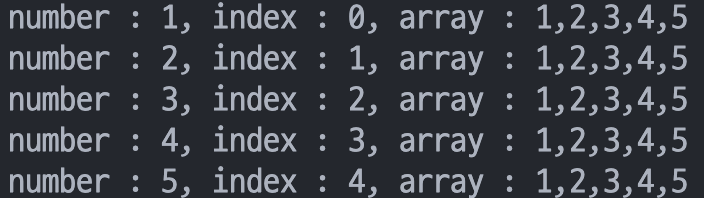 console.log(`number : ${number}, index : ${index}, array : ${array}`)