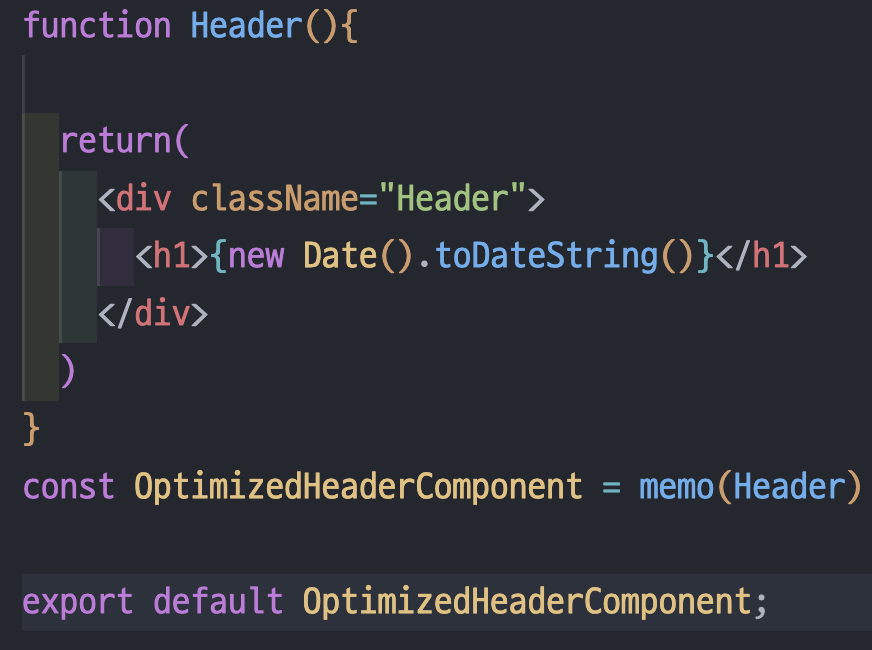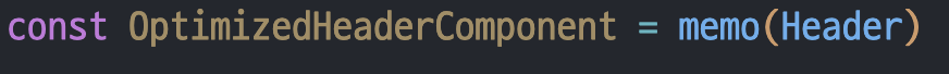 React의 memo라는 메서드는 인수로 컴포넌트를 전달받고, 최적화시킨 새로운 컴포넌트를 반환하는 메서드이다. 위처럼 사용하면 OptimizedHeaderComponent라는 변수에는 최적화된 Header 컴포넌트가 저장된다.